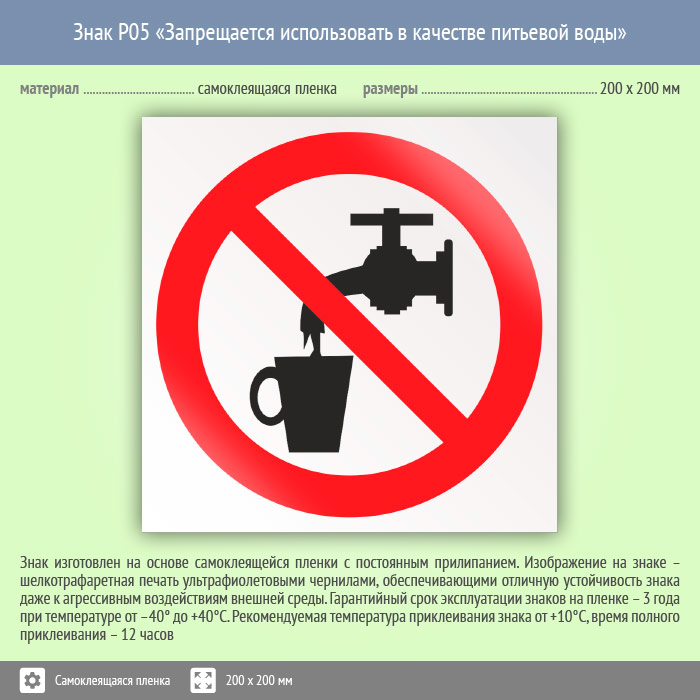 Знак P05 «Запрещается использовать в качестве питьевой воды» (пленка, 200х200 мм) в Яхроме купить