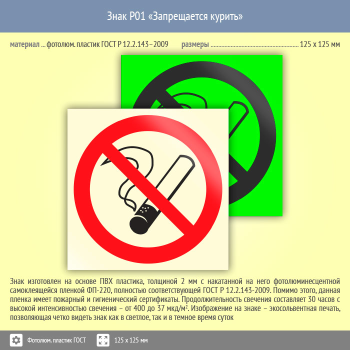 Знак P01 «Запрещается курить» (фотолюминесцентный пластик ГОСТ 34428-2018, 125х125 мм) в Яхроме купить
