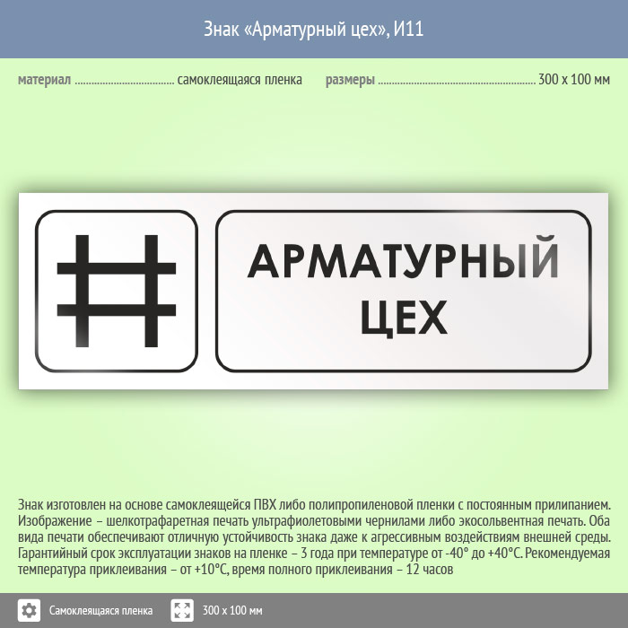 Знак «Арматурный цех» может быть изготовлен любого размера на самоклеящейся пленке, пластике толщиной 0.5, 2 или 4 мм и металле. Также возможно применение фотолюминесцентных и световозвращающих материалов