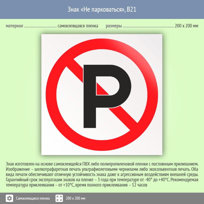 Знак «Не парковаться» может быть изготовлен любого размера на самоклеящейся пленке, пластике толщиной 0.5, 2 или 4 мм и металле. Также возможно применение фотолюминесцентных и световозвращающих материалов