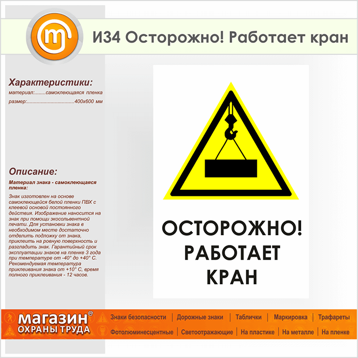 Табличка «Осторожно! Работает кран» предупреждает о работе крана и возможных опасностях, связанных с работой крана. Код знака: И34