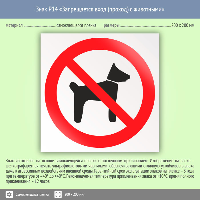 Знак «Запрещается вход (проход) с животными» может быть изготовлен любого размера на самоклеящейся пленке, пластике толщиной 0.5, 2 или 4 мм и металле. Также возможно применение фотолюминесцентных и световозвращающих материалов