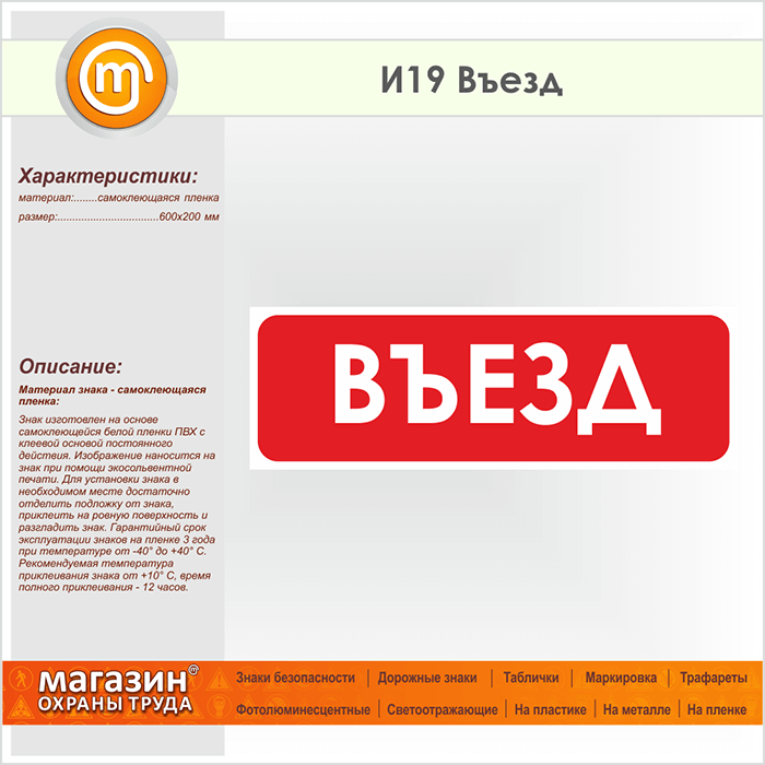 Знак «Въезд», И19 (пленка, 600х200 мм)