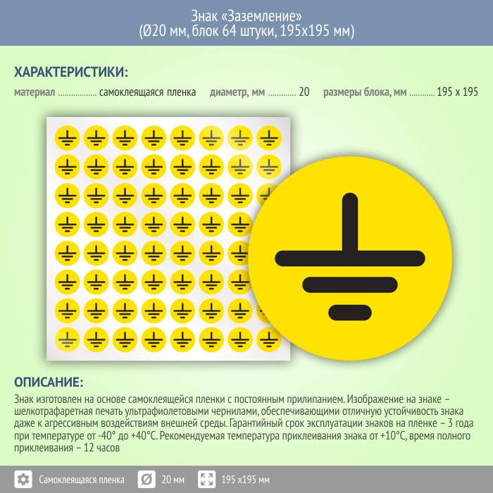 Знак (плакат) «Заземление», S46 (пленка, диаметр 20 мм, блок 64 штуки, 195х195 мм) в Яхроме купить