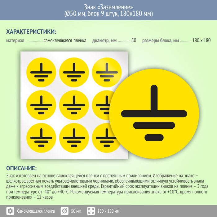 Знак (плакат) «Заземление», S46 (пленка, диаметр 50 мм, блок 9 штук, 180х180 мм) в Яхроме купить