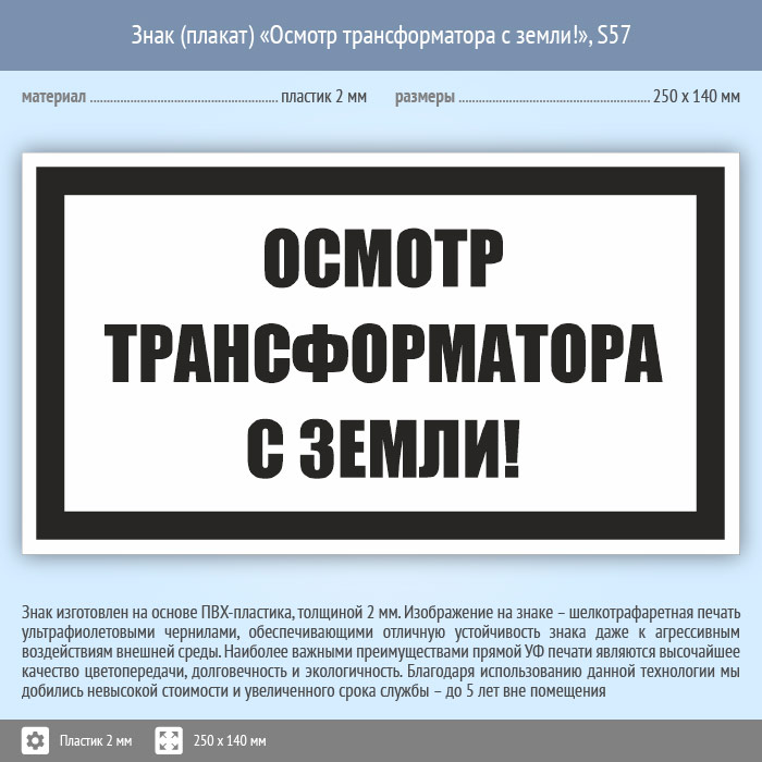 Знак (плакат) «Осмотр трансформатора с земли!», S57 (пластик, 250х140 мм) в Яхроме купить