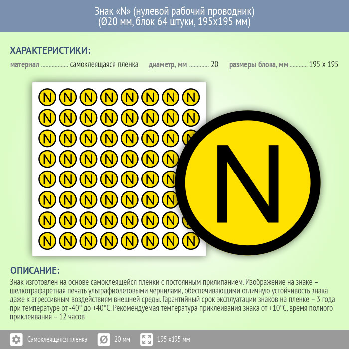 Знак (плакат) «N» (нулевой рабочий проводник), S47 (пленка, диаметр 20 мм, блок 64 штуки, 195х195 мм) в Яхроме купить