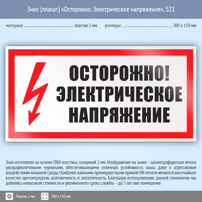 Знак (плакат) «Осторожно. Электрическое напряжение», S21 (пластик, 300х150 мм) в Яхроме купить