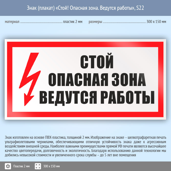 Знак (плакат) «Стой! Опасная зона. Ведутся работы», S22 (пластик, 300х150 мм) в Яхроме купить