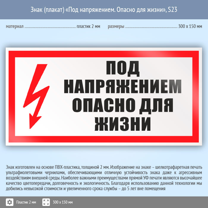 Знак (плакат) «Под напряжением. Опасно для жизни», S23 (пластик, 300х150 мм) в Яхроме купить