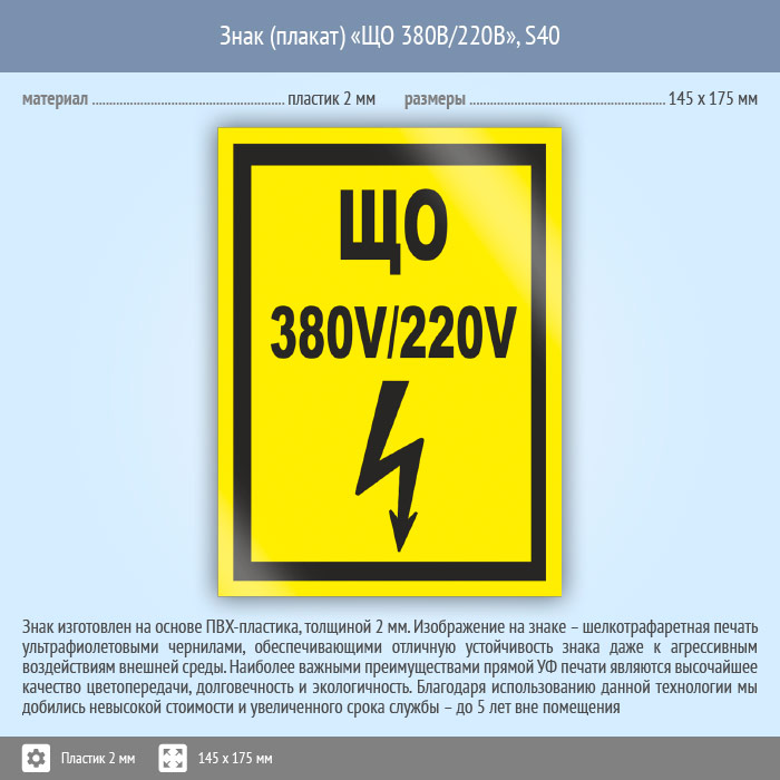 Знак (плакат) «ЩО 380В/220В», S40 (пластик, 145х175 мм) в Яхроме купить
