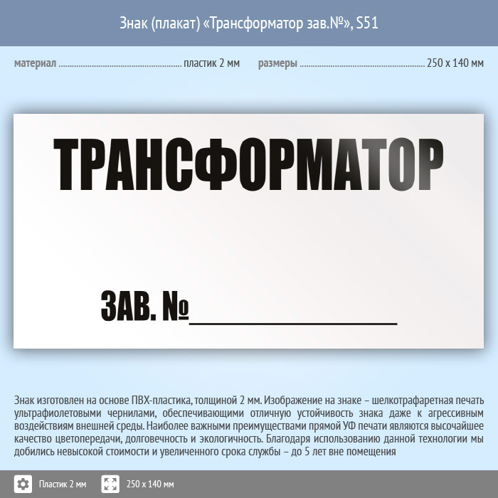 Знак (плакат) «Трансформатор зав.№», S51 (пластик, 250х140 мм) в Яхроме купить