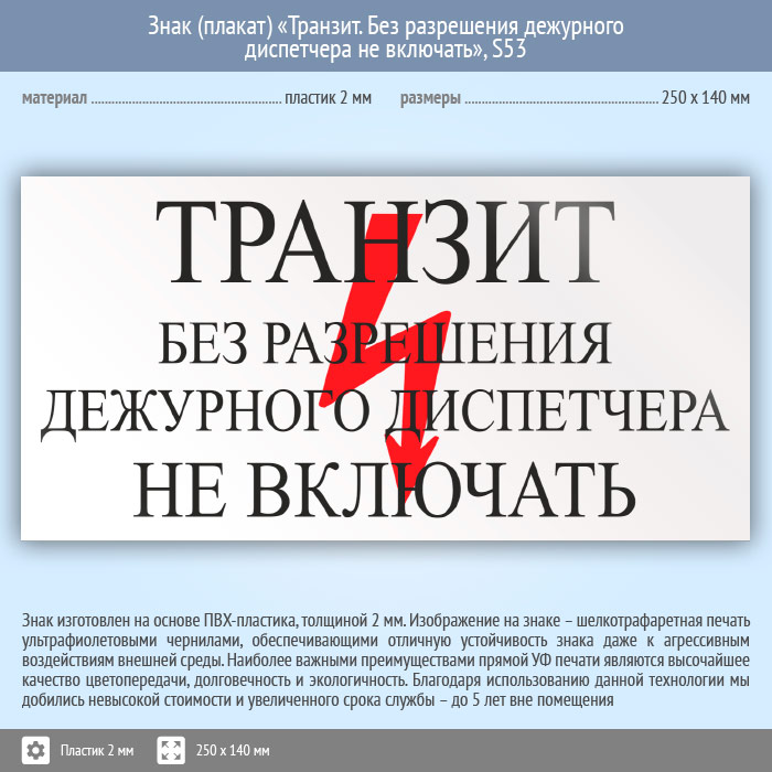 Знак (плакат) «Транзит. Без разрешения дежурного диспетчера Не включать», S53 (пластик, 250х140 мм) в Яхроме купить