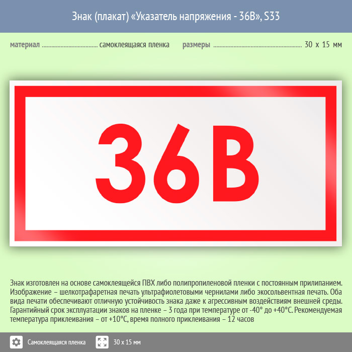 Знак (плакат) «Указатель напряжения - 36В», S33 (50 штук, пленка, 30х15 мм) в Яхроме купить