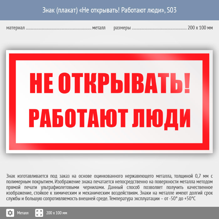 Знак (плакат) «Не открывать! Работают люди», S03 (металл, 200х100 мм) в Яхроме купить