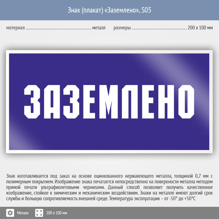 Знак (плакат) «Заземлено», S05 (металл, 200х100 мм) в Яхроме купить