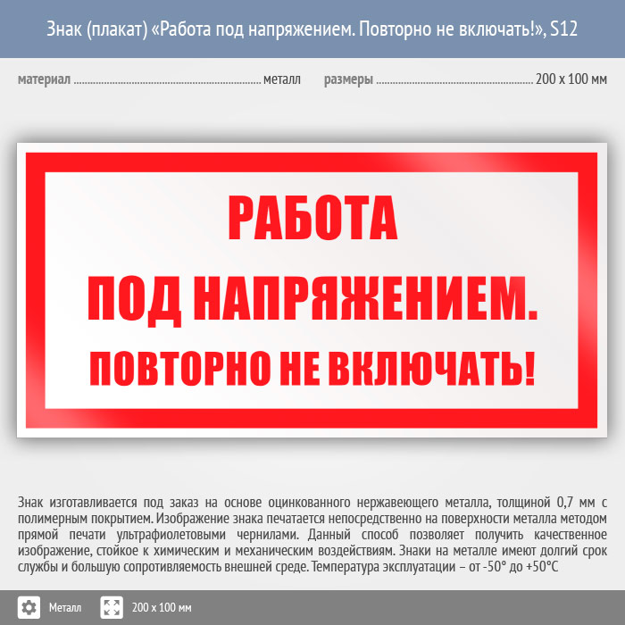 Знак (плакат) «Работа под напряжением. Повторно не включать!», S12 (металл, 200х100 мм) в Яхроме купить