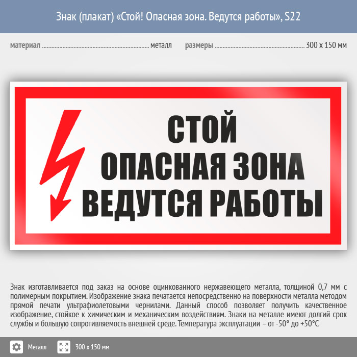 Знак (плакат) «Стой! Опасная зона. Ведутся работы», S22 (металл, 300х150 мм) в Яхроме купить