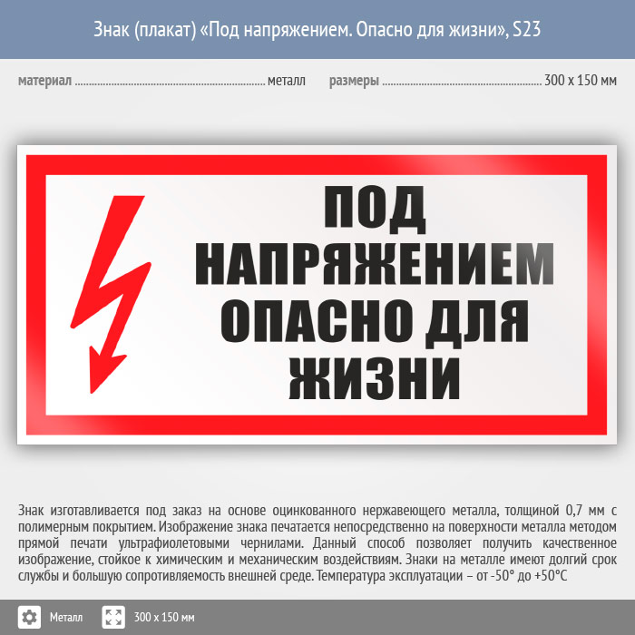 Знак (плакат) «Под напряжением. Опасно для жизни», S23 (металл, 300х150 мм) в Яхроме купить