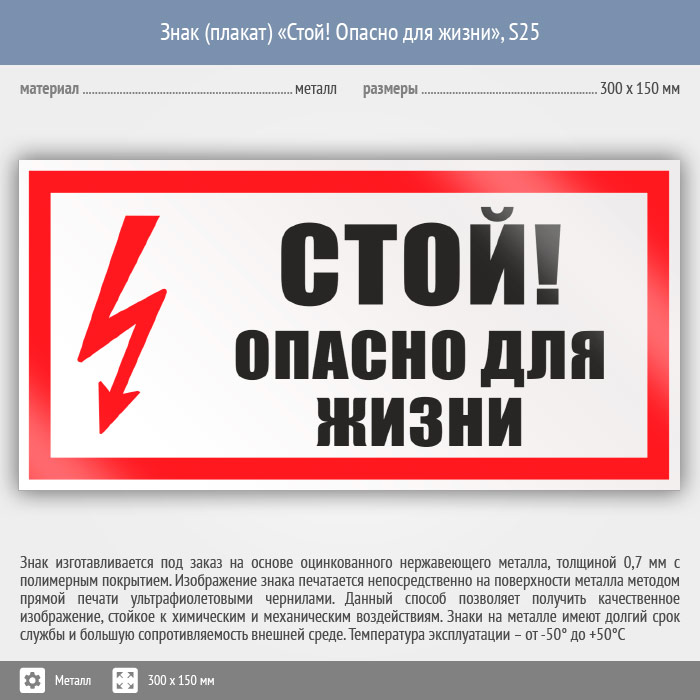Знак (плакат) «Стой! Опасно для жизни», S25 (металл, 300х150 мм) в Яхроме купить