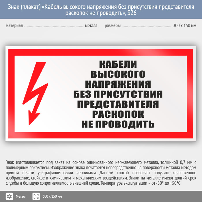 Знак (плакат) «Кабель высокого напряжения без присутствия представителя раскопок не проводить», S26 (металл, 300х150 мм) в Яхроме купить
