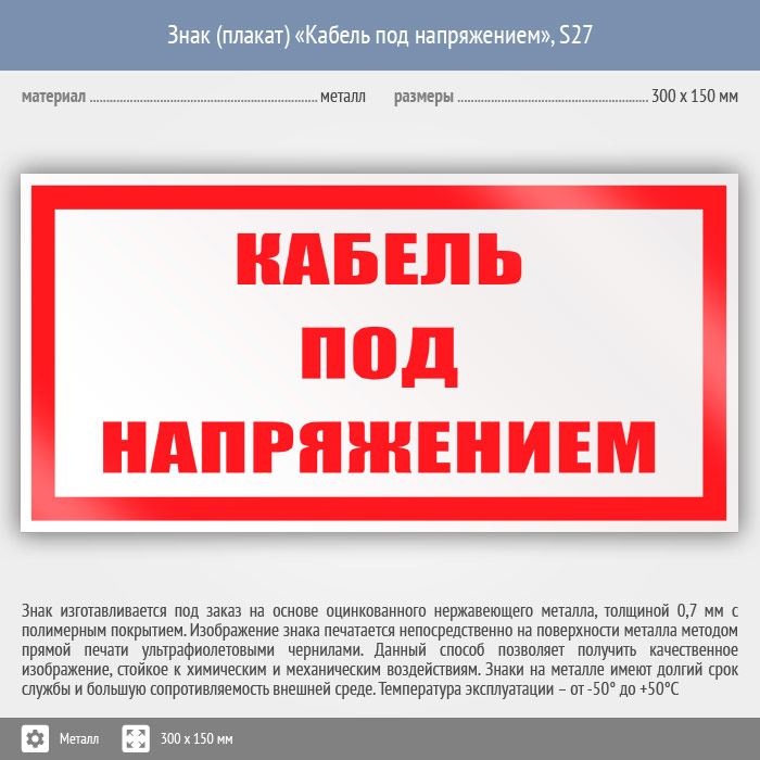 Знак (плакат) «Кабель под напряжением», S27 (металл, 300х150 мм) в Яхроме купить