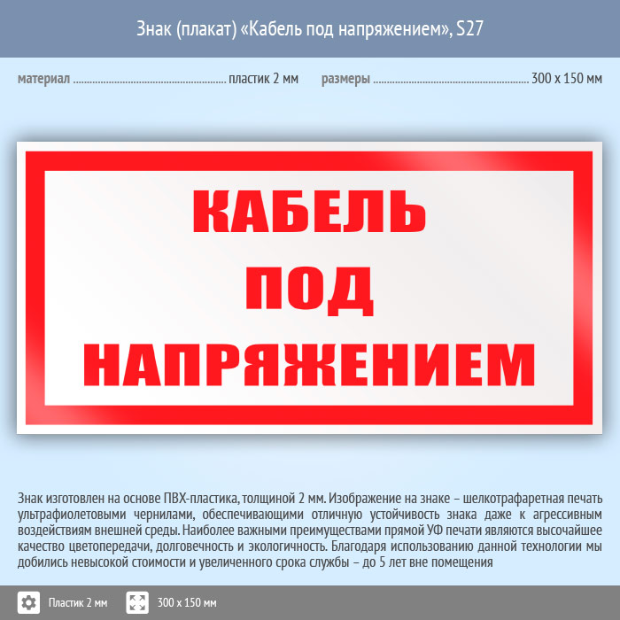 Знак (плакат) «Кабель под напряжением», S27 (пластик, 300х150 мм) в Яхроме купить