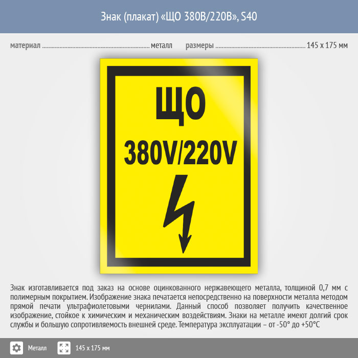 Знак (плакат) «ЩО 380В/220В», S40 (металл, 145х175 мм) в Яхроме купить