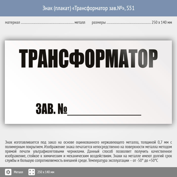 Знак (плакат) «Трансформатор зав.№», S51 (металл, 250х140 мм) в Яхроме купить