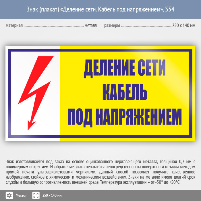 Знак (плакат) «Деление сети. Кабель под напряжением», S54 (металл, 250х140 мм) в Яхроме купить