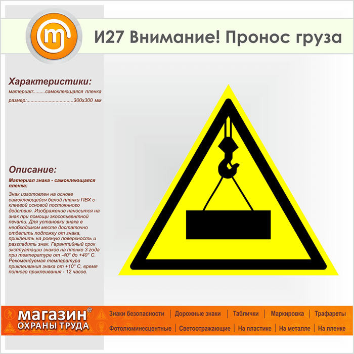 Знак «Внимание! Пронос груза», И27 (пленка, сторона 300 мм) в Яхроме купить