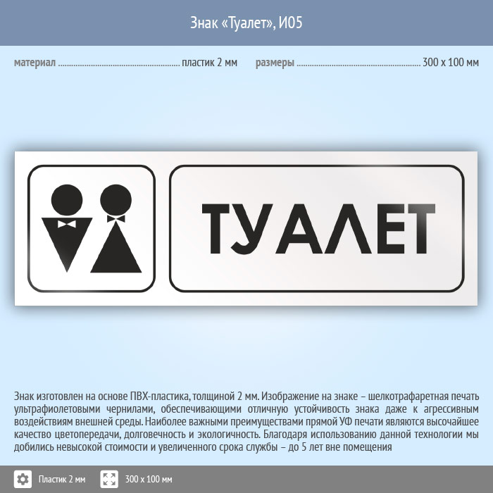 Знак «Туалет», И05 (пластик, 300х100 мм) в Яхроме купить