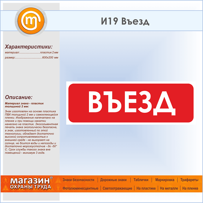 Знак «Въезд», И19 (пластик, 600х200 мм) в Яхроме купить