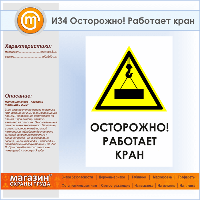 Знак «Осторожно! Работает кран», И34 (пластик, 400х600 мм) в Яхроме купить