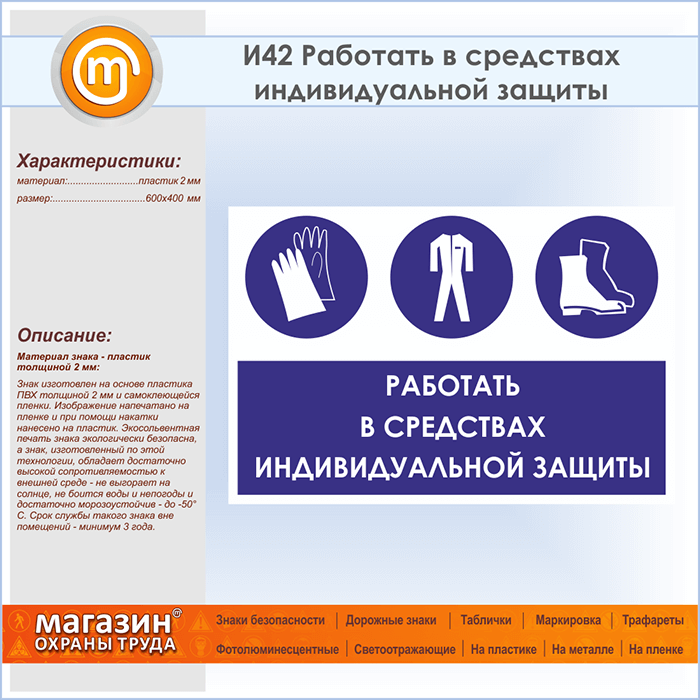 Знак «Работать в средствах индивидуальной защиты», И42 (пластик, 600х400 мм) в Яхроме купить