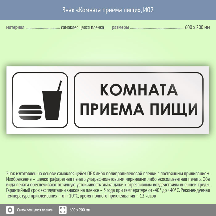 Знак «Комната приема пищи», И02 (пленка, 600х200 мм) в Яхроме купить
