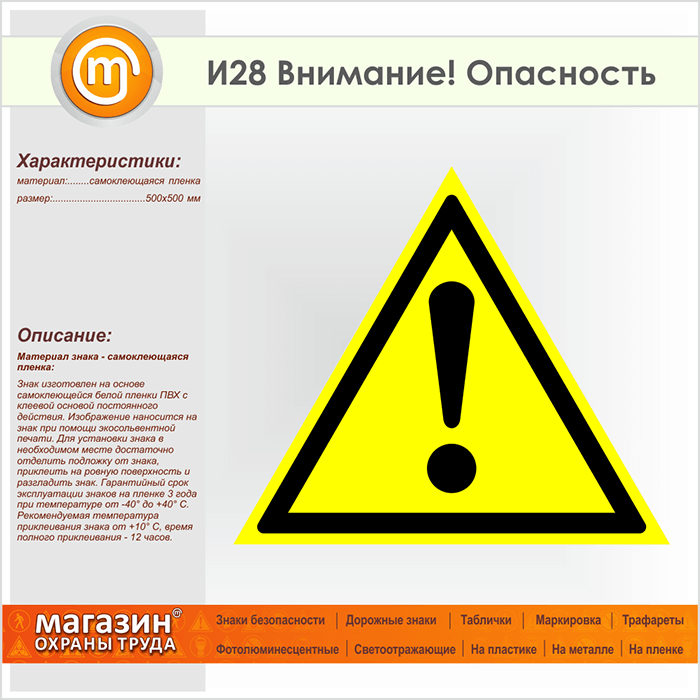 Знак «Внимание! Опасность», И28 (пленка, сторона 500 мм) в Яхроме купить