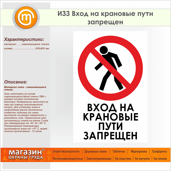 Знак «Вход на крановые пути запрещен», И33 (пленка, 600х900 мм) в Яхроме купить