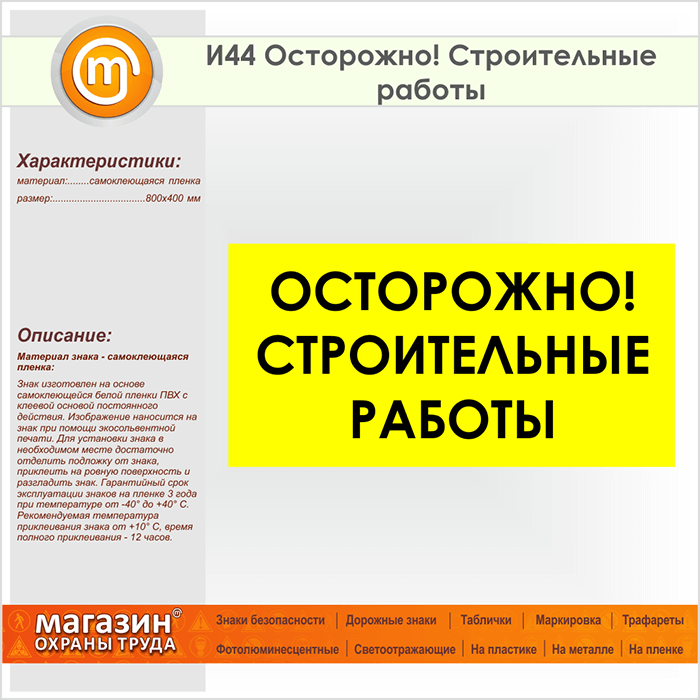 Знак «Осторожно! Строительные работы», И44 (пленка, 800х400 мм) в Яхроме купить