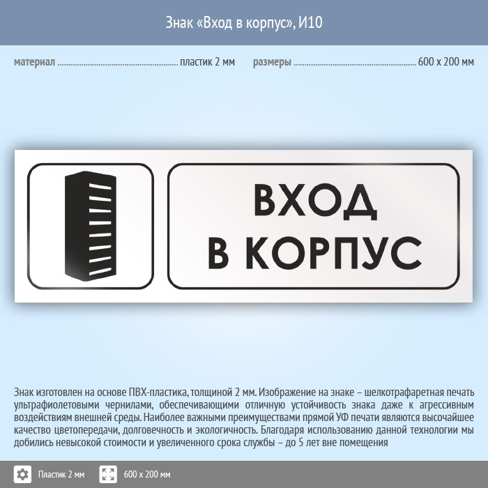 Знак «Вход в корпус», И10 (пластик, 600х200 мм) в Яхроме купить
