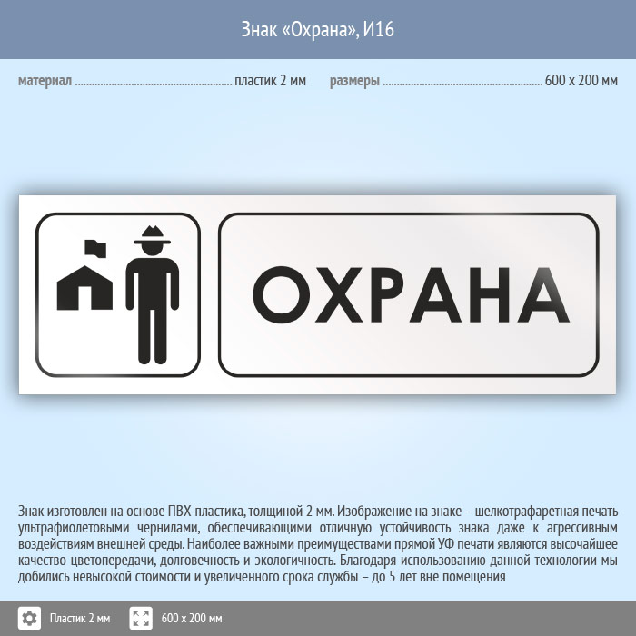 Знак «Охрана», И16 (пластик, 600х200 мм) в Яхроме купить