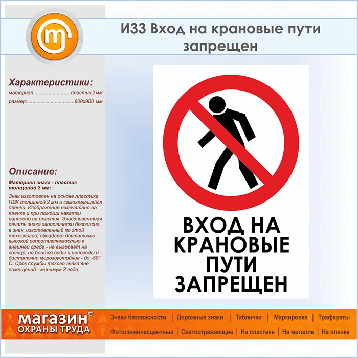 Знак «Вход на крановые пути запрещен», И33 (пластик, 600х900 мм) в Яхроме купить