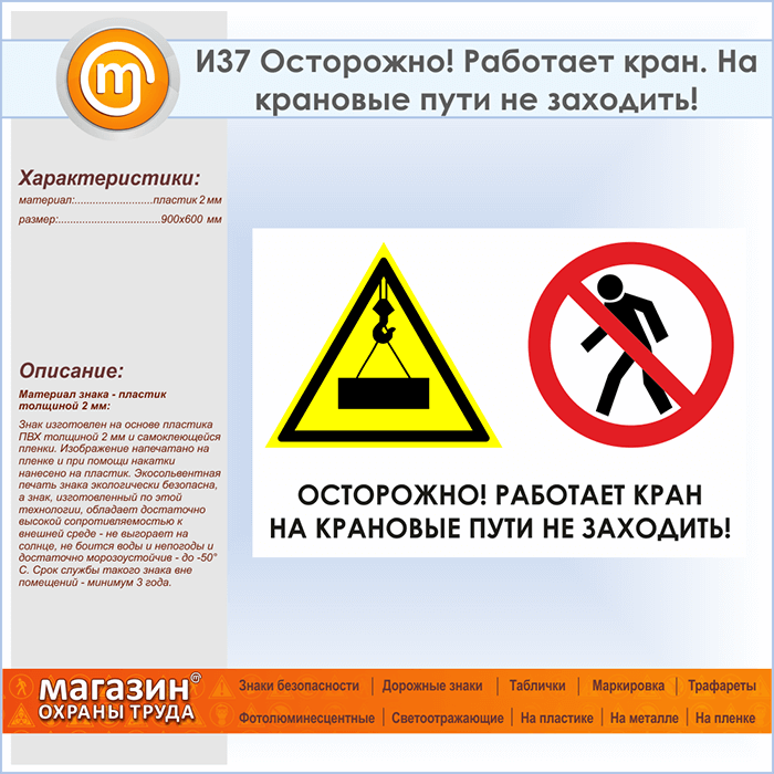 Знак «Осторожно! Работает кран. На крановые пути не заходить!», И37 (пластик, 900х600 мм) в Яхроме купить