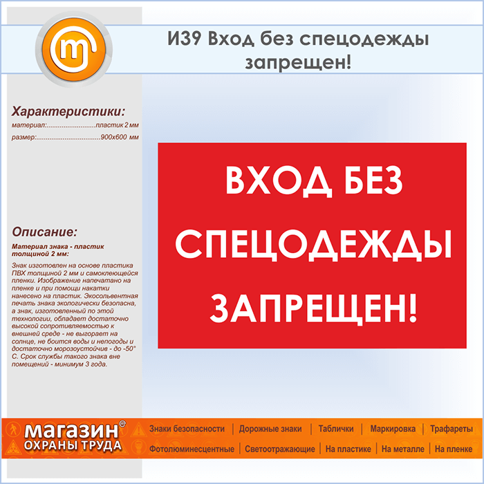 Знак «Вход без спецодежды запрещен!», И39 (пластик, 900х600 мм) в Яхроме купить