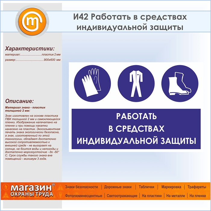 Знак «Работать в средствах индивидуальной защиты», И42 (пластик, 900х600 мм) в Яхроме купить