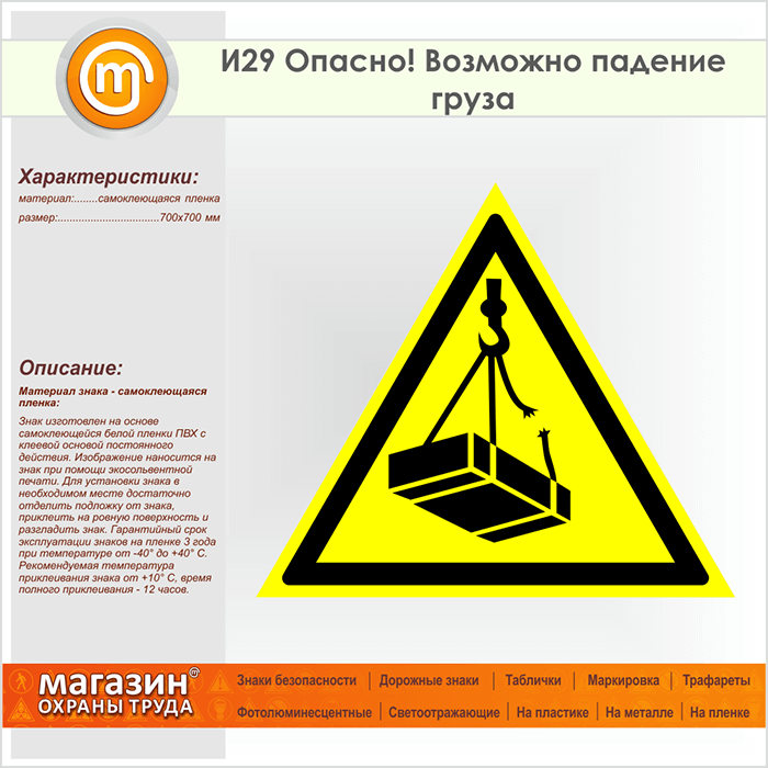 Знак «Опасно! Возможно падение груза», И29 (пленка, сторона 700 мм) в Яхроме купить