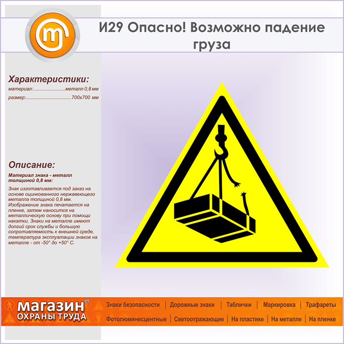 Знак «Опасно! Возможно падение груза», И29 (металл, сторона 700 мм) в Яхроме купить