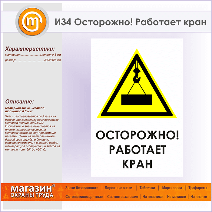 Знак «Осторожно! Работает кран», И34 (металл, 400х600 мм) в Яхроме купить