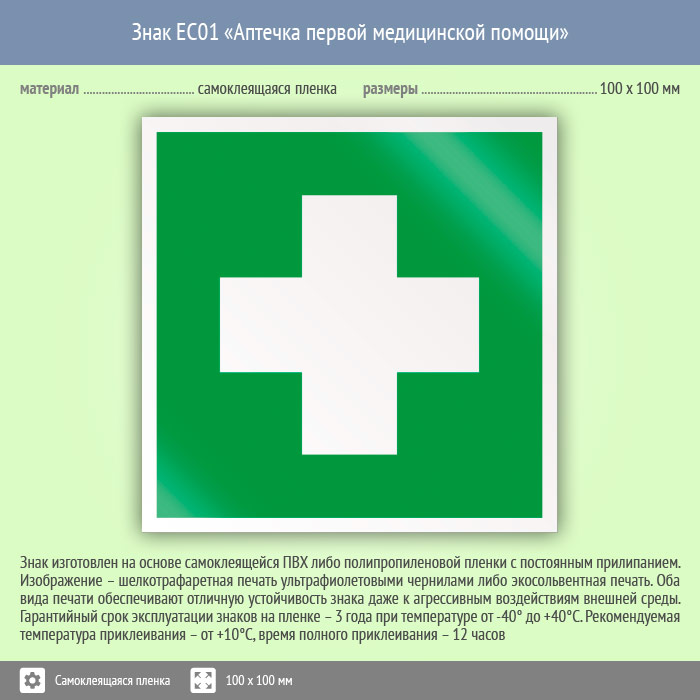 Знак EC01 «Аптечка первой медицинской помощи» (пленка, 100х100 мм) в Яхроме купить