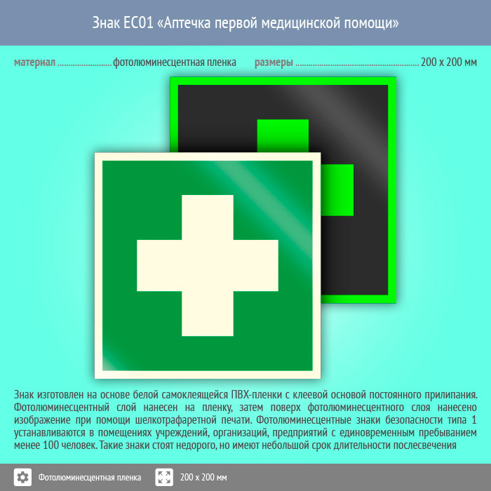 Знак EC01 «Аптечка первой медицинской помощи» (фотолюминесцентная пленка, 200х200 мм) в Яхроме купить
